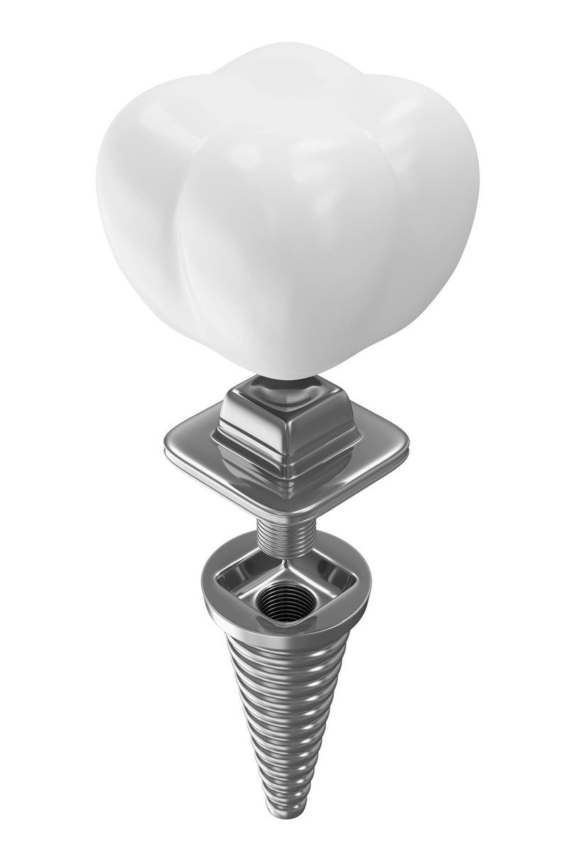Как выглядит зубной имплантат? Имплантат сделан из титанового сплава, абсолютно совместимого с костными тканями, этот материал полностью безопасен для здоровья человека. Имплантат представляет собой шуруп, который ввинчивается в нижнюю или верхнюю челюсть. На имплантате (шурупе) фиксируется коронка или протез. Имплантат сделан из двух частей: абатмента и шурупа (на абатменте фиксируется зуб).